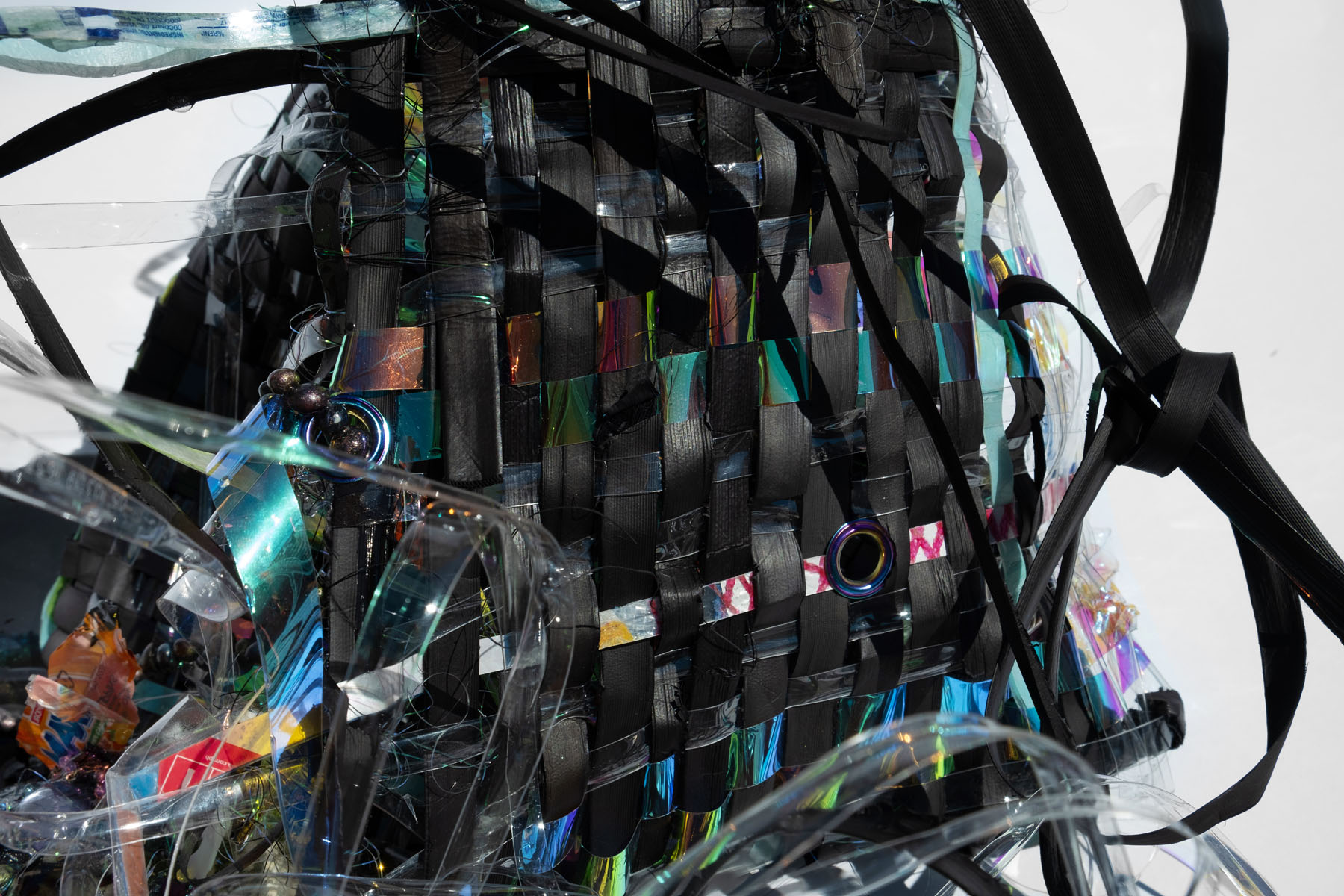 | Handwoven dyed pandan leaf, plastic water bottle, dichroic film, and plastic discards with grommets, souvenir shell, cast cement paving stone, model artificial turf, epoxy clay, resin, DVDs, iPhone 5 hardware, glass, mylar sachet, plastic bread tab, silica desiccant beads, archival gloss varnish, polypropylene tarp, opalescent metallic thread, bismuth, mica, obsidian, silicone, iron oxide pigment, mica pigment, interference pigment, powder pigment |