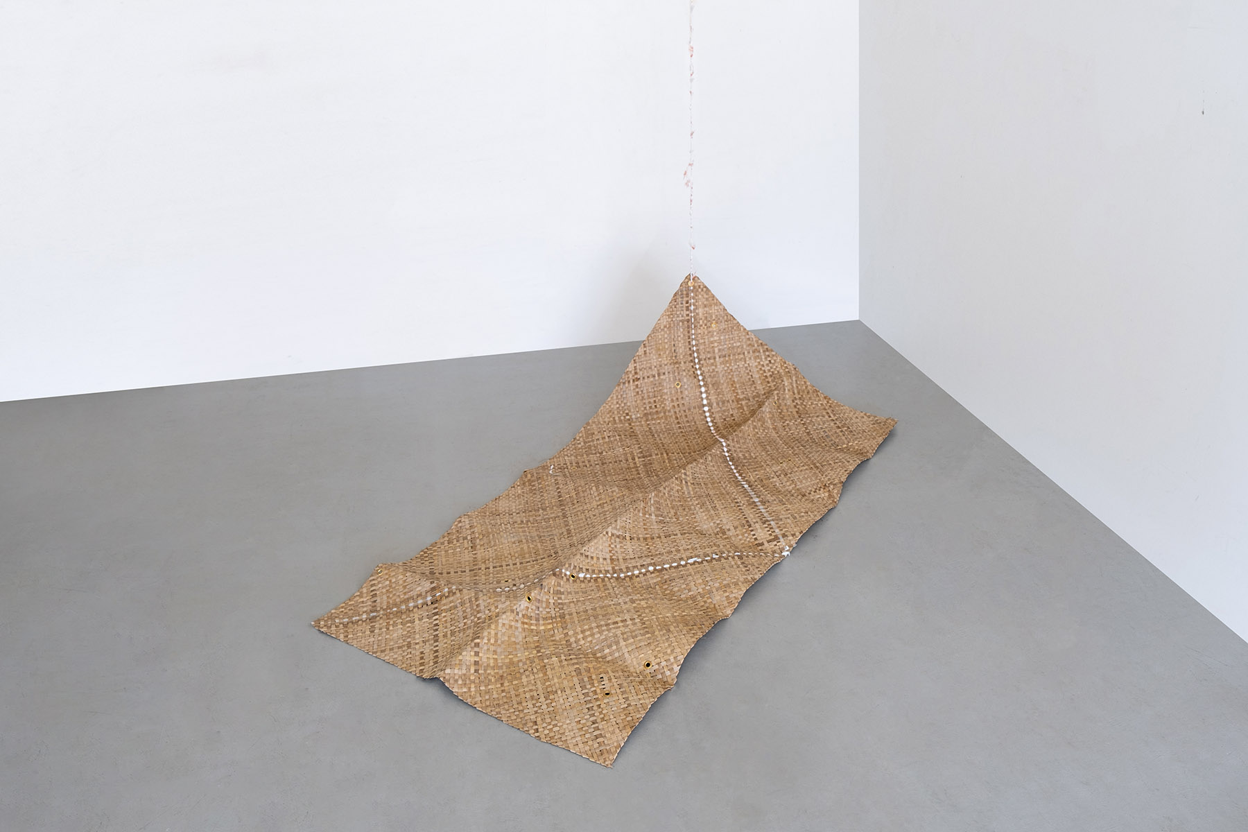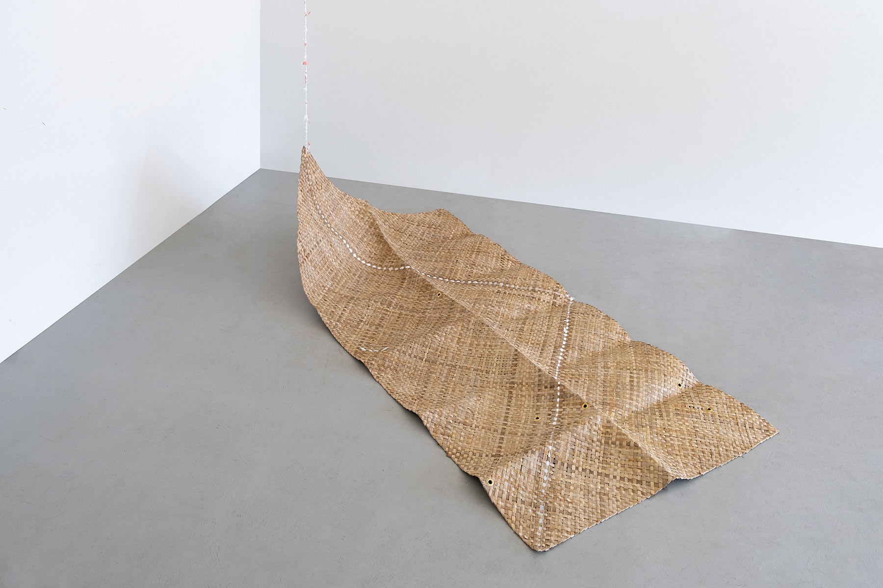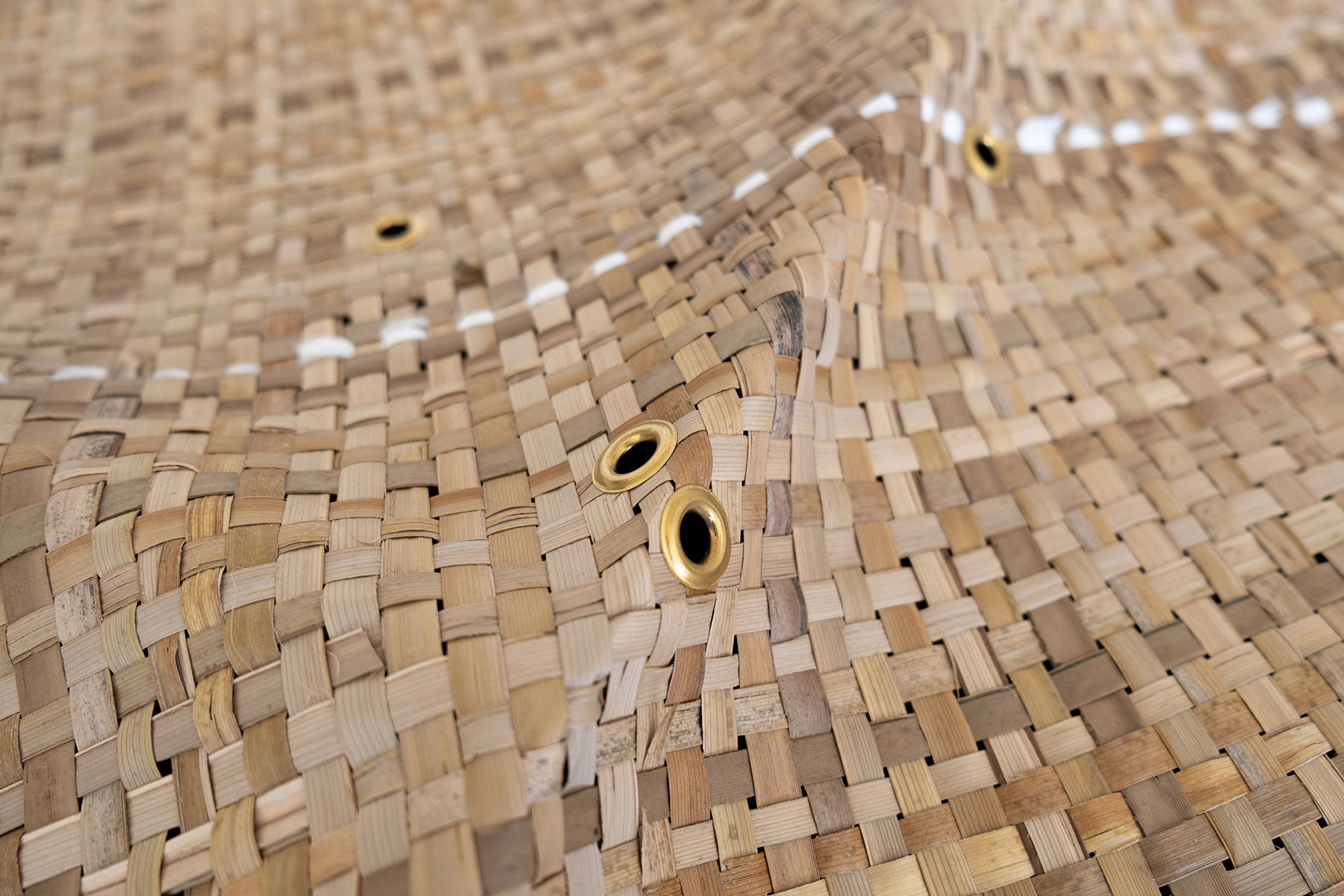 Handwoven Mexican fan palm fronds, grommets, plastic shopping bags