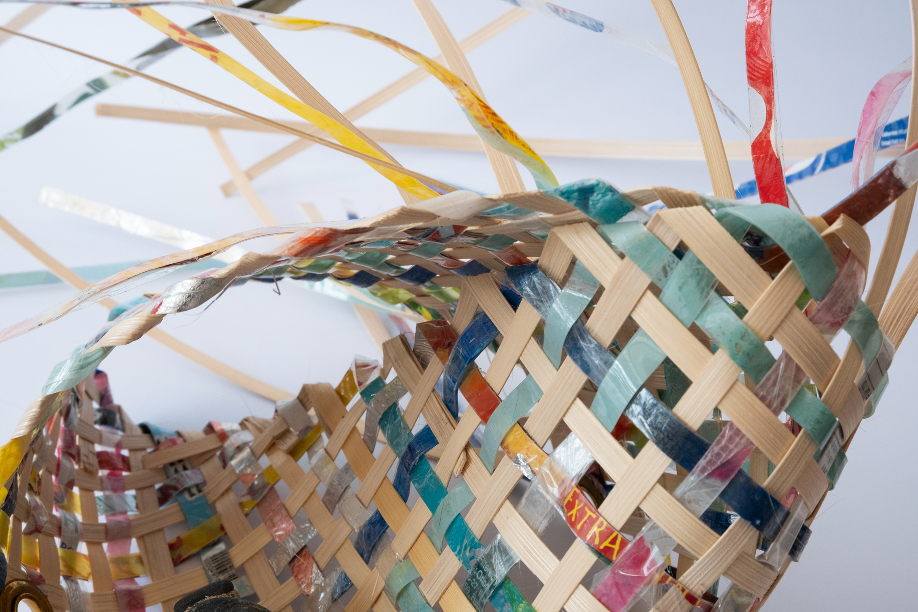 Handwoven bamboo, foraged discarded plastics, grommets, found conglomerate
